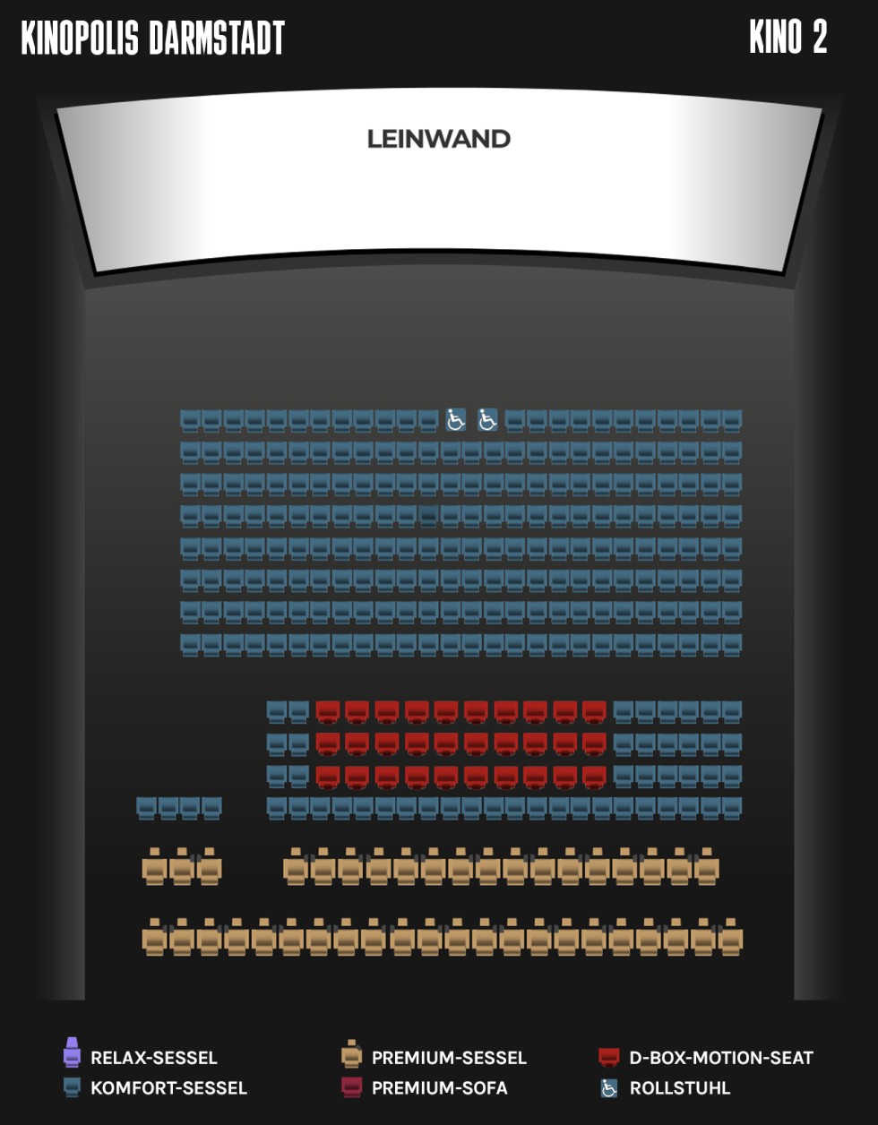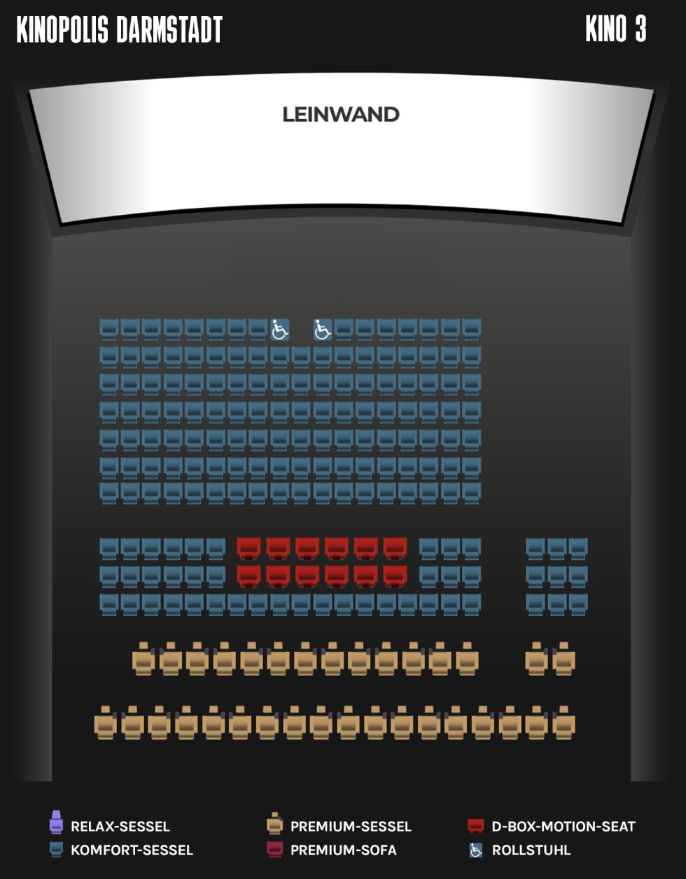 Sitzplätze:134 (davon 24 Premium-Sessel, 12 D-Box Seats + 1 Rollstuhlplatz)