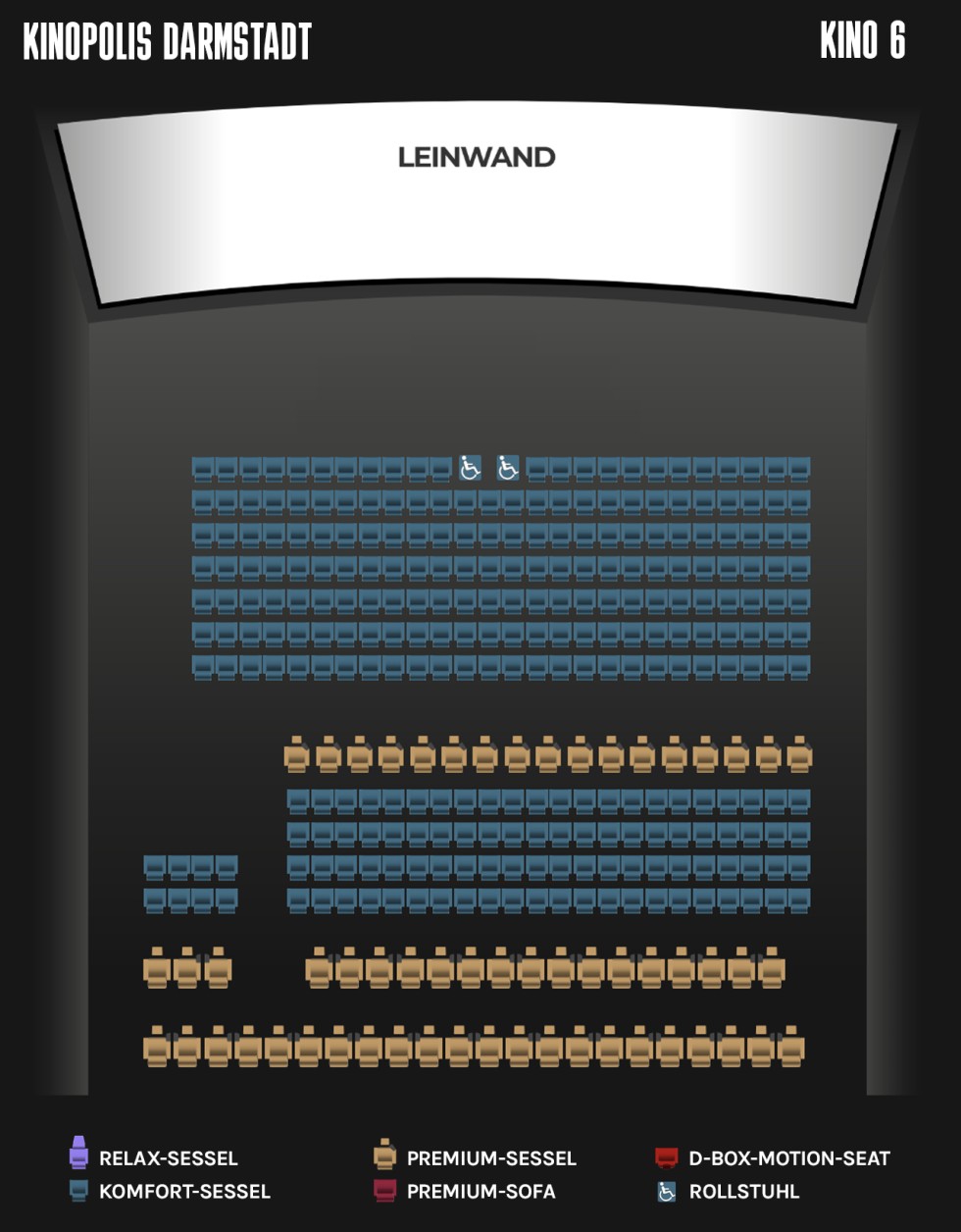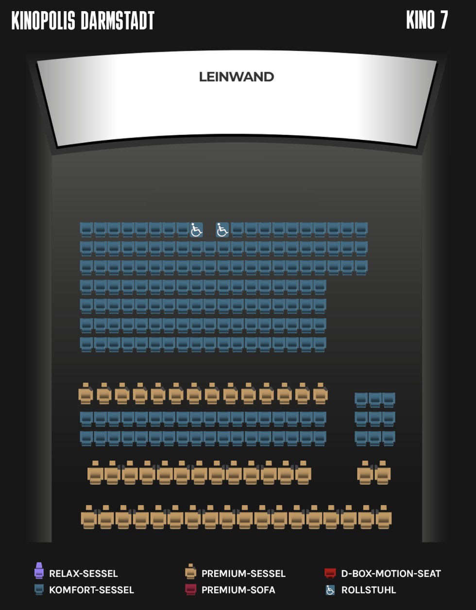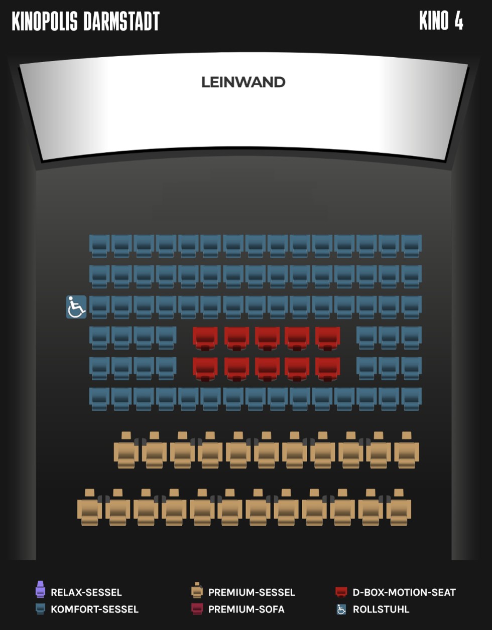 Sitzplätze:109 (davon 23 Premium-Sessel, 10 D-Box Seats + 1 Rollstuhlplatz)