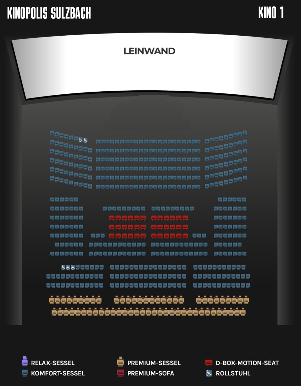 Sitzplätze:278 (davon 35 Premium-Sessel und 12 D-BOX-Seats)